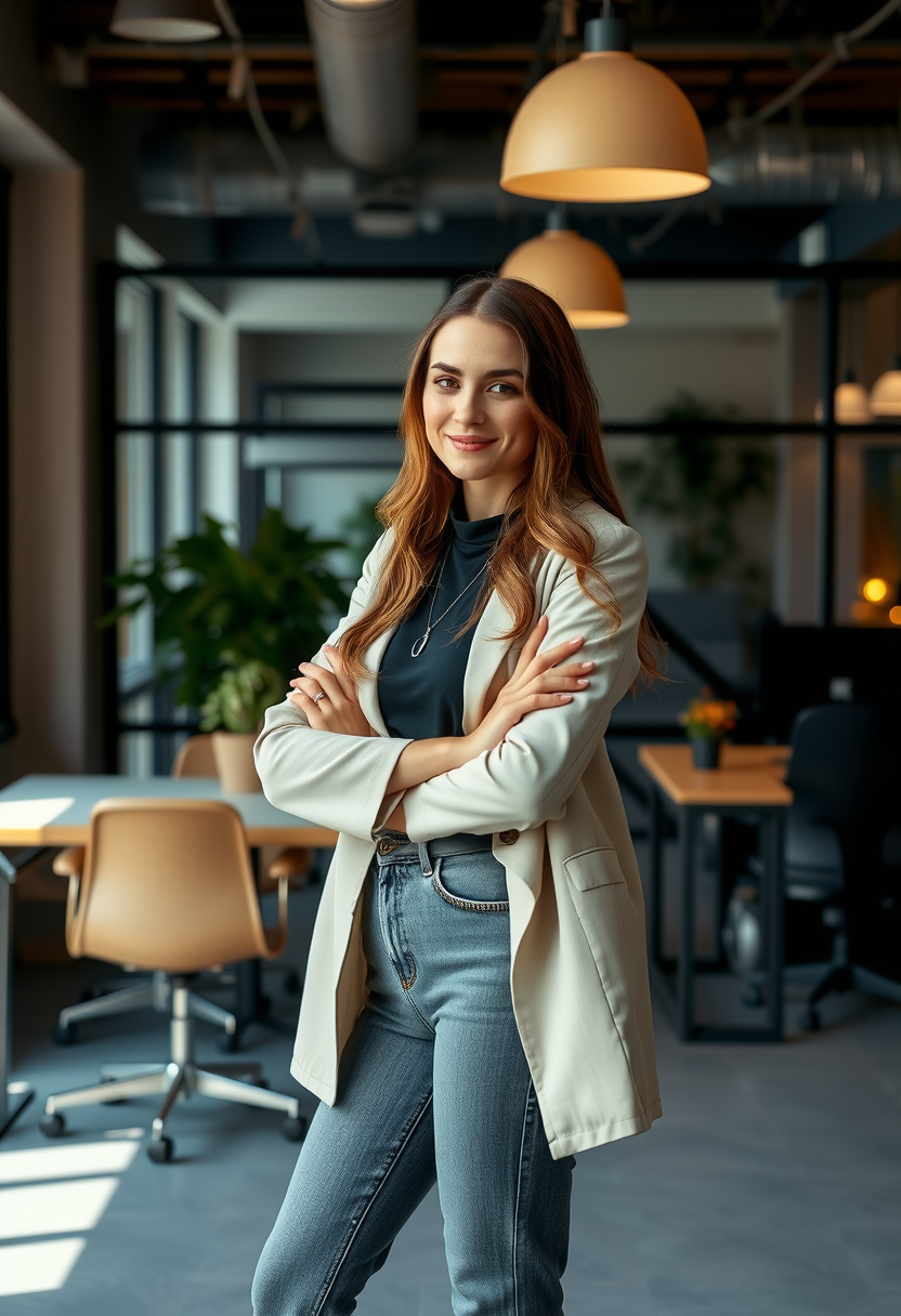 • Dunkle Jeans mit eleganter Bluse und strukturierter Jacke (z. B. Blazer oder Kurzjacke)