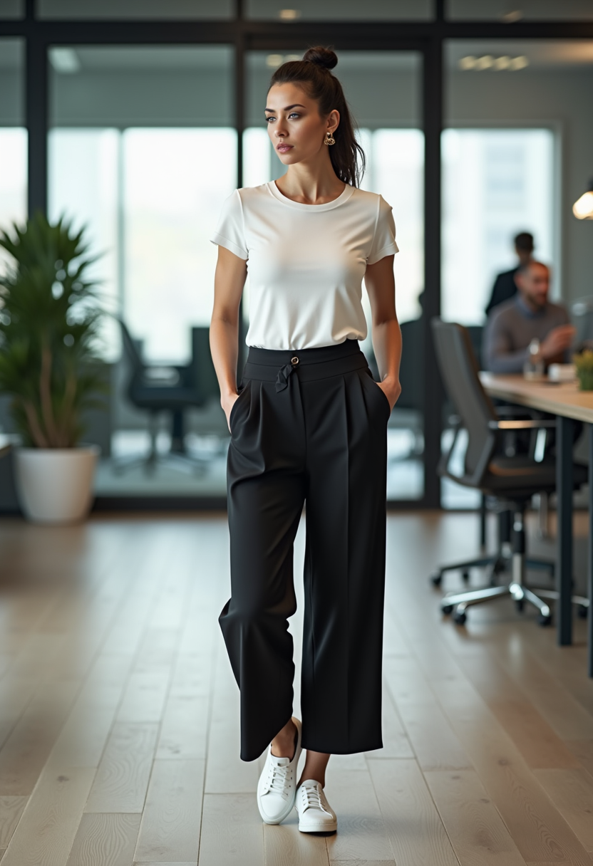 • Culottes oder weite Stoffhose mit figurbetontem Top oder T-Shirt und Statement-Blazer